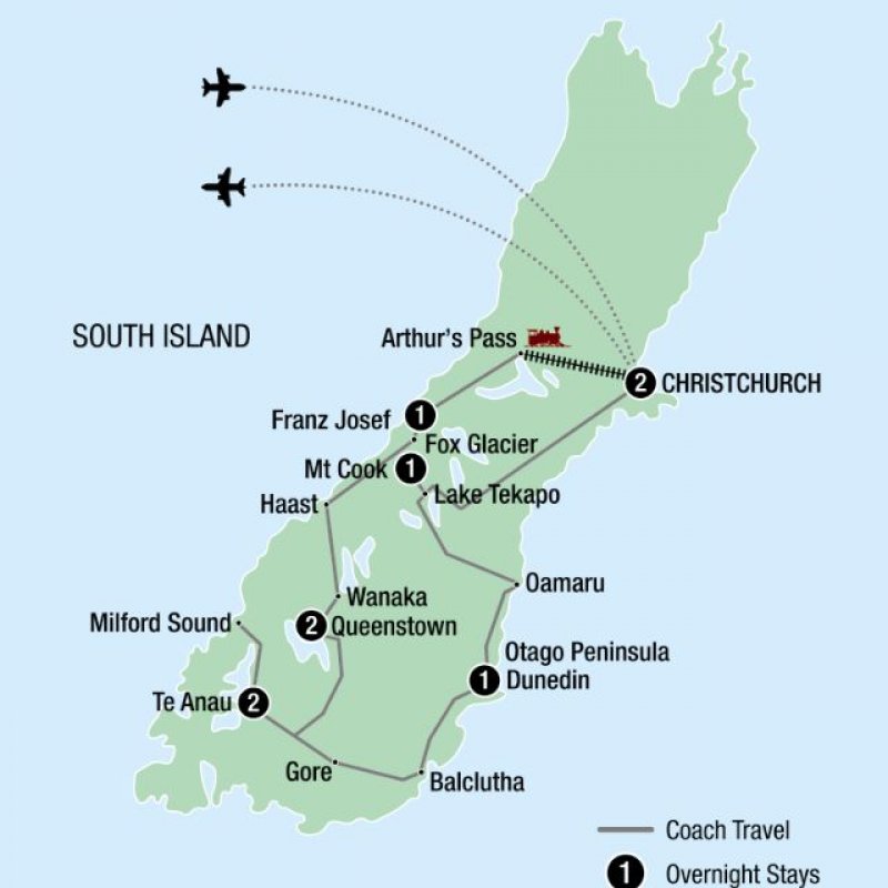 Christchurch, Dunedin, Franz Josef, Kaikoura, Nelson, Punakaiki, Queenstown